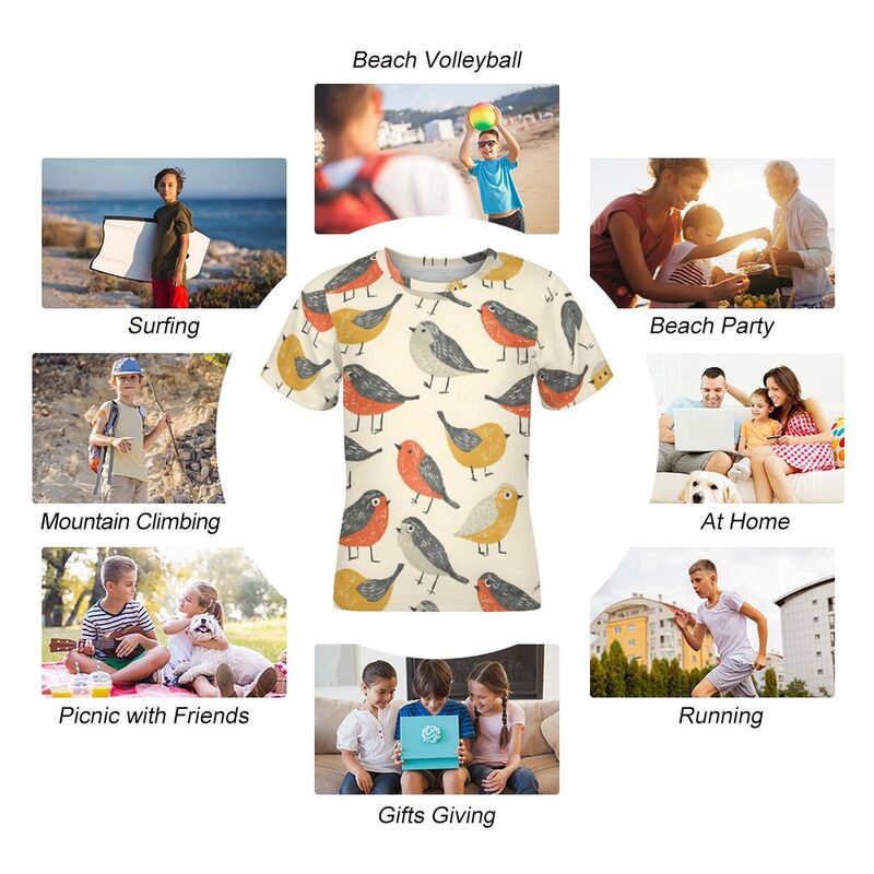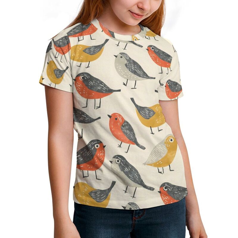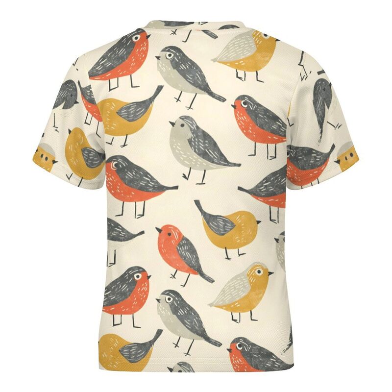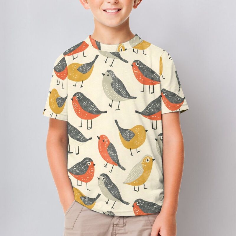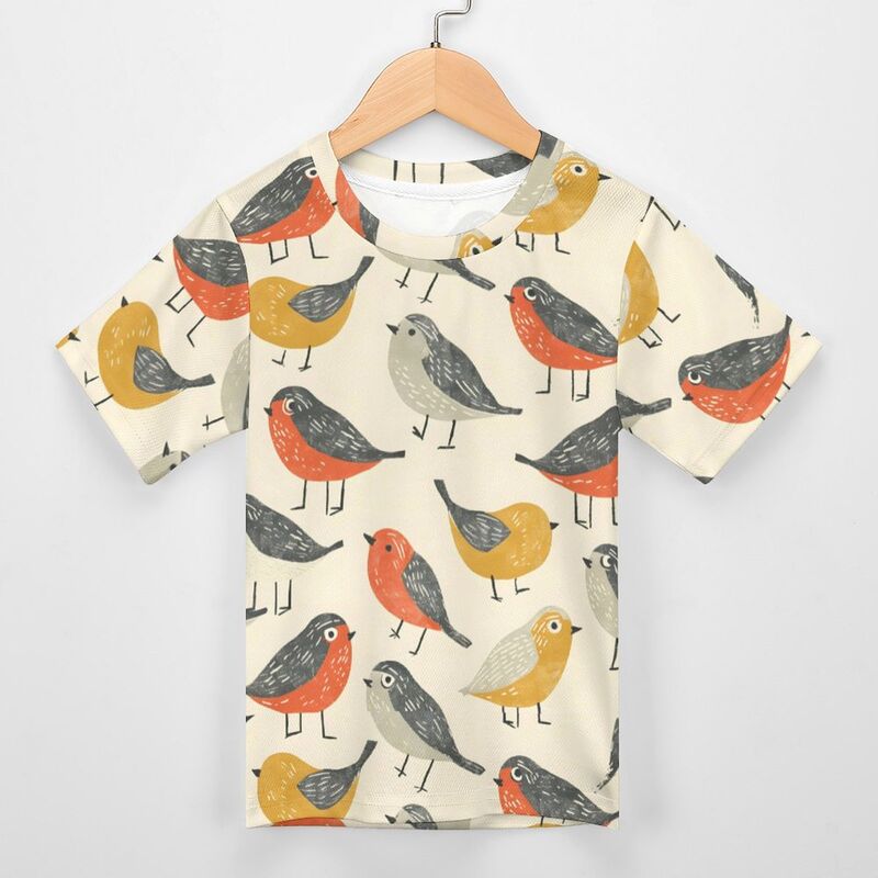 HugLittle Playful Bird Design Children's T-Shirt: Mid-Century Style in Light Red, Dark Gray, and Yellow Shades