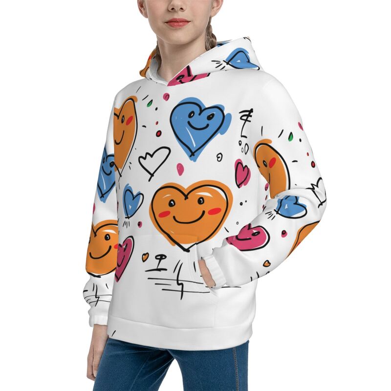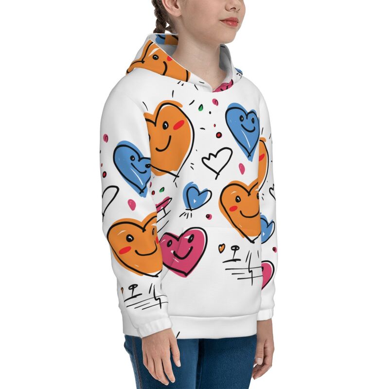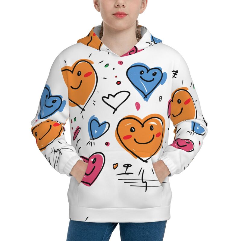 Huglittle Youth Hoodie: Playful Hearts & Character Illustration Design in Vibrant Colors